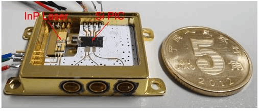 针对以上困难挑战,研究团队提出了硅基与铟磷材料平台混合集成的技术方案,将两种集成材料平台的性能优势互补,如图1所示。在铟磷集成平台上实现高功率窄线宽的激光器,而在硅基平台上利用标准硅光工艺单片集成了双驱马赫-曾德尔电光调制器、高品质因子微环和锗硅探测器。利用微光学元件辅助的方法将硅基芯片与铟磷芯片耦合互连,实现了微波光子滤波器的全系统芯片化。封装完成的微波光子滤波器尺寸仅有一枚五角硬币的大小,如图2所示。该滤波器展现出优异的滤波性能:频率调谐范围覆盖S波段至K波段(3-25 GHz)、3 dB滤波线宽360 MHz、带外抑制比高于40 dB;同时,其滤波响应可在带通滤波与带阻滤波两种工作模式间快速切换,切换响应时间仅需48 μs。